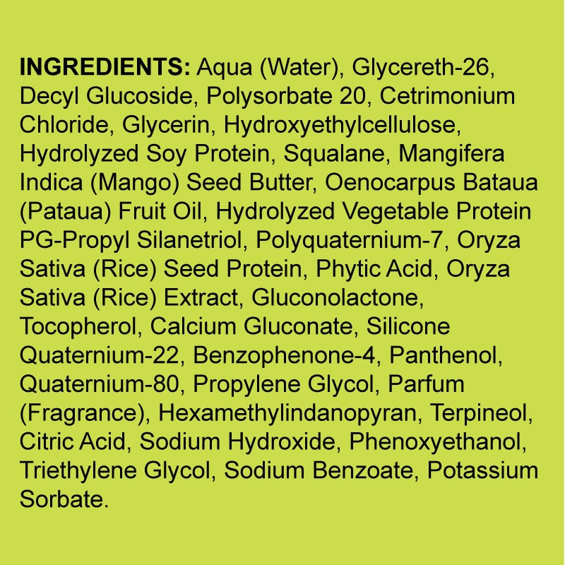 Aqua (Water), Glycereth-26, Decyl Glucoside, Polysorbate 20, Cetrimonium Chloride, Glycerin, Hydroxyethylcellulose, Hydrolyzed Soy Protein, Squalane, Mangifera Indica (Mango) Seed Butter, Oenocarpus Bataua (Pataua) Fruit Oil, Hydrolyzed Vegetable Protein PG-Propyl Silanetriol, Polyquaternium-7, Oryza Sativa (Rice) Seed Protein, Phytic Acid, Oryza Sativa (Rice) Extract, Gluconolactone, Tocopherol, Calcium Gluconate, Silicone Quaternium-22, Benzophenone-4, Panthenol, Quaternium-80, Propylene Glycol, Parfum (Fragrance), Hexamethylindanopyran, Terpineol, Citric Acid, Sodium Hydroxide, Phenoxyethanol, Triethylene Glycol, Sodium Benzoate, Potassium Sorbate.